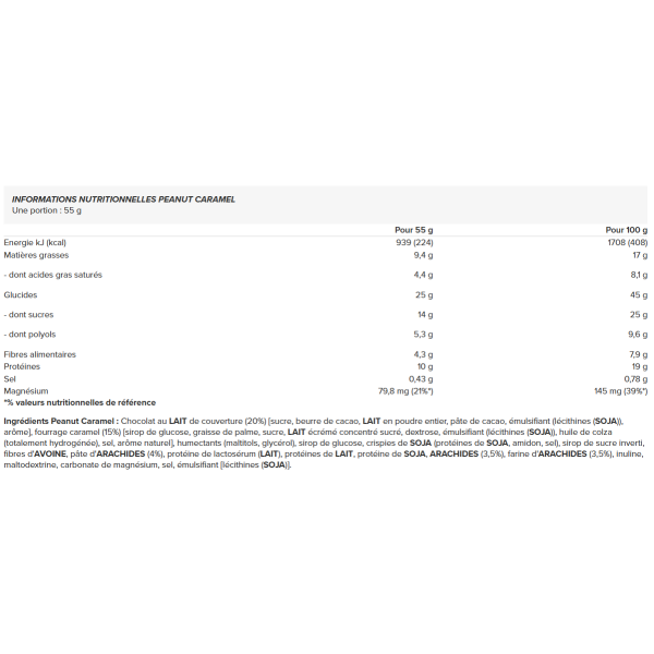 Ingrediënten Karamelchocolade : Melkchocolade couverture (20%) [suiker, cacaoboter, volle melkpoeder, cacaomassa, emulgator (lecithinen(SOY)), aroma], karamelvulling (15%) [glucosestroop, palmvet, suiker, gezoete gecondenseerde magere MELK, dextrose, emulgator (lecithinen(SOY)), koolzaadolie (volledig gehard), zout, natuurlijk aroma], bevochtigingsmiddelen (maltitols, glycerol), glucosestroop, SOYA chips (SOYA eiwit, zetmeel, zout), invertsuikerstroop, wei-eiwit(MELK), MELK eiwit, SOYA eiwit, ARACHIDEN (3,5%),havervezels,ALMOND pasta, inuline, magere cacaopoeder (2,5%), maltodextrine, aroma, magnesiumcarbonaat, zout, emulgator (lecithinen(SOYA)).