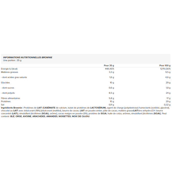 Ingrediënten Brownie: MELK eiwit( calciumCASEINAAT, LACTOSERUM eiwit isolaat), vulstof (polydextrose), bevochtigingsmiddelen (sorbitol, glycerol), MELK chocolade met zoetstof (18%) [zoetstof (maltitol), cacaoboter, hele MELK poeder, cacaomassa, watervrij MELKvet (CH: geconcentreerde boter(MELK)), emulgator (lecithinen(SOYA)), aroma], magere cacaopoeder (5%), SOYA eiwit, raapzaadolie, aroma, emulgator (lecithinen(SOYA)). Kan bevatten: TARWE, BARLEY, OATS, ARACHIDES, ALMONDEN, CHERRIES, CASH-NOETTEN.
