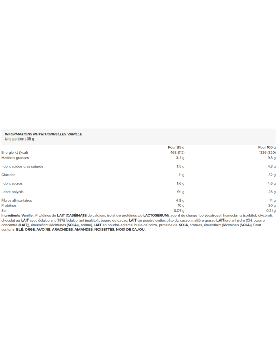 Ingrediënten Vanille: MELK eiwit( calciumCASEINAAT, LACTOSERUM eiwit isolaat), vulstof (polydextrose), bevochtigingsmiddelen (sorbitol, glycerol), MELK chocolade met zoetstof (18%) [zoetstof (maltitol), cacaoboter, volle MELK poeder, cacaomassa, watervrij MELKvet (CH: geconcentreerde boter(MELK)), emulgator (lecithinen(SOYA)), aroma], mager MELKpoeder, raapzaadolie, SOYA-eiwit, aroma, emulgator (lecithinen(SOYA)). Kan bevatten: TARWE, BARLEY, OATS, ARACHIDEN, ALMONDEN, CHERRIEN, CASH NOUTEN.