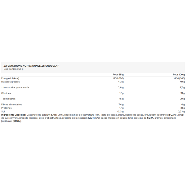 Ingrediënten chocolade: Calciumcaseïnaat(MELK) (21%), donkere couverturechocolade (18%) [cacaomassa, suiker, cacaoboter, emulgator (lecithinen(SOYA))], invertsuikerstroop, fructosestroop, oligofructosestroop, wei-eiwit(MELK) (8%), mager cacaopoeder (5%), SOYA-eiwit, aroma's, emulgator (lecithinen(SOYA)).