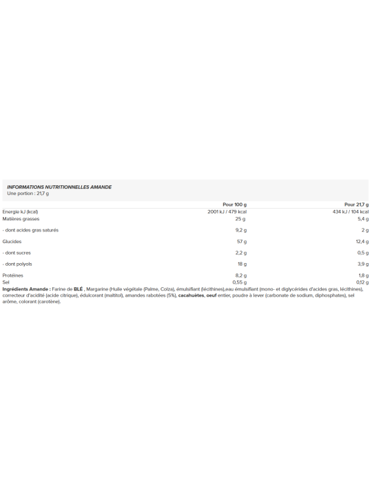 Ingredienten Amandel :Meel van TARWE, margarine (plantaardige olie (palm, koolzaad), emulgator (lecithinen), emulgerend water (mono- en diglyceriden van vetzuren, lecithinen), zuurteregelaar (citroenzuur), zoetstof (maltitol), amandelen geschaafd (5%), pinda's, , Ei volkoren, rijsmiddel (natriumcarbonaat, difosfaten), zout, aroma, kleurstof (caroteen).