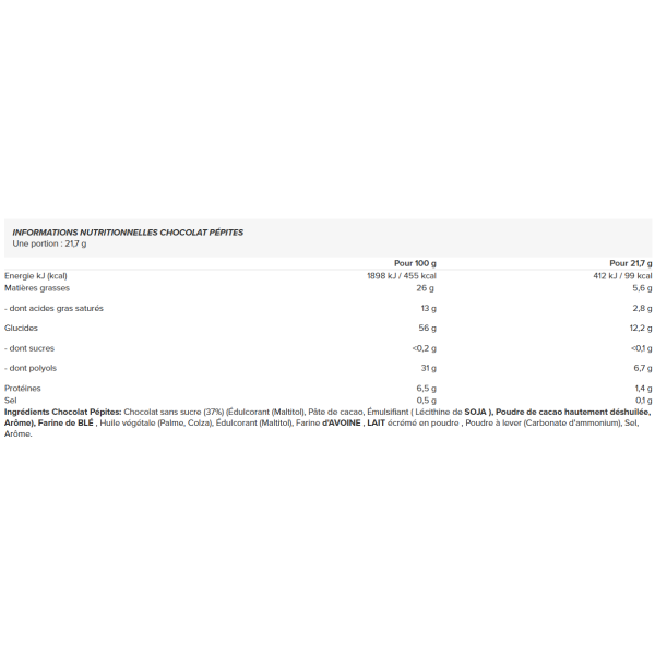 Ingrediënten Chocolade Nuggets :Suikervrije chocolade (37%) (zoetstof (maltitol), cacaomassa, emulgator (cacaolecithine)) SOJA),Ontvet cacaopoeder, aroma), cacaomeel TARWE, plantaardige olie (palm, koolzaad), zoetstof (maltitol), meel d'AVOINE, , MELK mageremelkpoeder, bakpoeder (ammoniumcarbonaat), zout, aroma.
