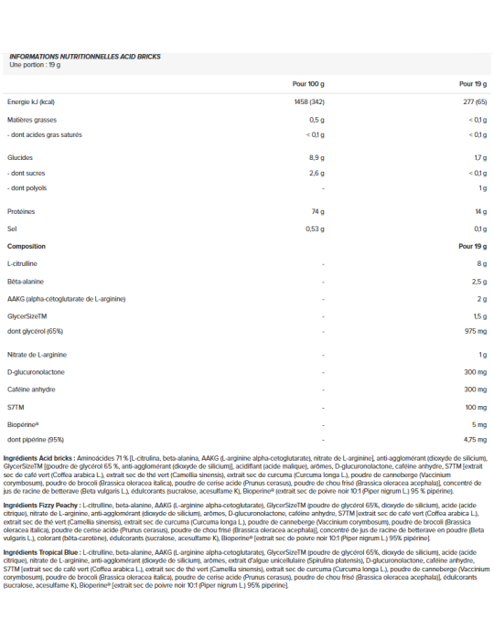 Tropical Blue-ingrediënten : L-citrulline, bèta-alanine, AAKG (L-arginine alfa-cetoglutaraat), GlycerSizeTM (65% glycerolpoeder, siliciumdioxide), zuur (citroenzuur), L-argininenitraat, antiklontermiddel (siliciumdioxide), aroma's, eencellig algenextract (Spirulina platensis), D-glucuronolacton, watervrije cafeïne, S7TM [extrait sec de café vert (Coffea arabica L.), extrait sec de thé vert (Camellia sinensis), extrait sec de curcuma (Curcuma longa L.), poudre de canneberge (Vaccinium corymbosum), poudre de brocoli (Brassica oleracea italica), poudre de cerise acide (Prunus cerasus), poudre de chou frisé (Brassica oleracea acephala)], zoetstoffen (sucralose, acesulfaam K), Bioperine® [extrait sec de poivre noir 10:1 (Piper nigrum L.) 95% pipérine].