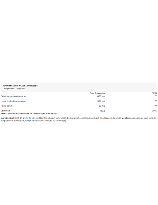 Ingrediënten : Extract van groene koffiebonen (Coffea robusta) 66%, vulstof (calciumfosfaten), capsulehuls(gelatine), antiklontermiddelen (magnesiumzouten van vetzuren, siliciumdioxide), chroom(III)chloride.