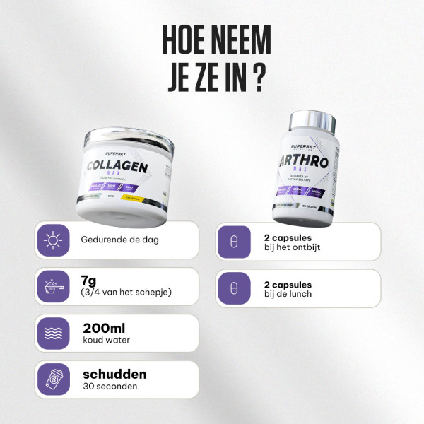 Dit pakket combineert twee essentiële producten om de gezondheid van gewrichten te ondersteunen, flexibiliteit te verbeteren en kraakbeen te versterken. Ideaal voor sporters of mensen die op zoek zijn naar meer comfort in hun dagelijks leven. Het biedt een complete oplossing voor sterke gewrichten en optimale mobiliteit.