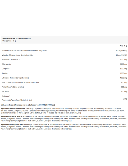 Tropical Punch ingrediënten: PureWay-C® (citrus ascorbinezuur en bioflavonoïden), vitamine B3 (in de vorm van nicotinamide), L-Citrulline Malaat 2.:1, Beta-alanine, L-arginine, Taurine, L-tyrosine (gefermenteerd veganistisch), VitaCholine® (als cholinebitartraat), PerforMelon®(Citrus lanatus), Zeezout, BioPerine®: Zwarte peper(Piper nigrum) fruitextract, aroma, sucralose, siliciumdioxide, kleurstof (E122).