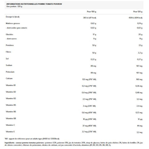 Ingrediënten - appel-tomato-peper smaak: appels 52%, paprika 13%, tomatensap 20%, glucosestroop, kikkererwtenmeel 3%, linzenmeel 2%, geconcentreerd citroensap, kaliumchloride, calciumcitraten, zout, geconcentreerd acerolasap, vitaminen (B1, B2, B3, B5, B6, B8, E).