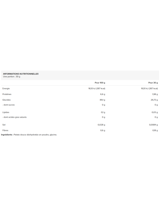 Ingrediënten: gedehydrateerd zoete aardappelpoeder, glycine.