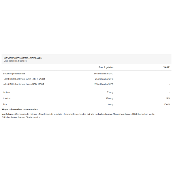 Ingrediënten : Calciumcarbonaat - Capsule omhulsel: hypromellose - Inuline geëxtraheerd uit agavebol (Agava tequilana) - Bifidobacterium lactis - Bifidobacterium breve - Zinkcitraat.