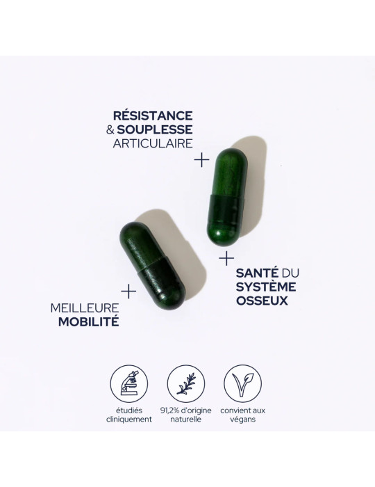 Of je nu sportief, actief of gewoon gevoelig bent voor stijve gewrichten, deze kuur werkt 360° om het ongemak te verlichten en je gewrichten te versterken. Het ondersteunt de botdichtheid door de opname van calcium te optimaliseren, terwijl het de natuurlijke productie van collageen stimuleert, essentieel voor de elasticiteit en weerstand van gewrichtsweefsel.
