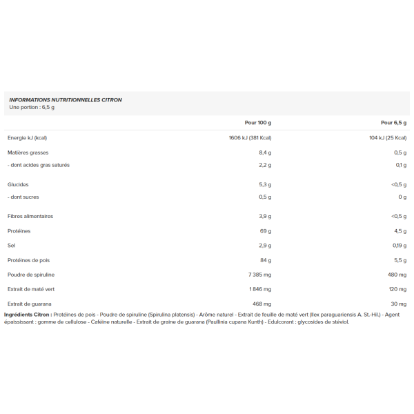 Ingrediënten Citroen: erwteneiwit - Spirulina poeder (Spirulina platensis) - Natuurlijk aroma - Groene maté blad extract (Ilex paraguariensis A. St.-Hil.) - Verdikkingsmiddel: cellulose gom - Natuurlijke cafeïne - Guarana zaadextract (Paullinia cupana Kunth) - Zoetstof: steviolglycosiden.