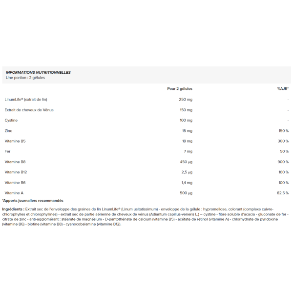 Ingrediënten: droog extract van LinumLife® (Linum usitatissimum) lijnzaadschil - capsule omhulsel: hypromellose, kleurstof (koper-chlorofylcomplex en chlorofyllin) - droog extract van venushaar antenne deel (Adiantum capillus-veneris L.) - cystine - oplosbare acaciavezels - ijzergluconaat - zinkcitraat - antiklontermiddel: magnesiumstearaat - calcium-D-pantothenaat (vitamine B5) - retinolacetaat (vitamine A) - pyridoxinehydrochloride (vitamine B6) - biotine (vitamine B8) - cyanocobalamine (vitamine B12).