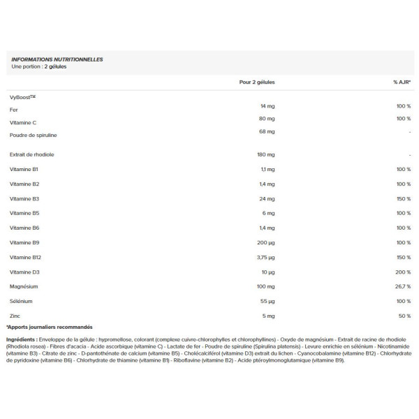 Ingrediënten : Capsule : hypromellose, kleurstof (koper-chlorofylcomplex en chlorofyllin) - Magnesiumoxide - Rhodiola wortel extract (Rhodiola rosea) - Acacia vezel - Ascorbinezuur (vitamine C) - IJzerlactaat - Spirulina poeder (Spirulina platensis) - Met selenium verrijkte gist - Nicotinamide (vitamine B3) - Zinkcitraat - Calcium d-pantothenaat (vitamine B5) - Cholecalcium (vitamine B6) - Cholesterol (vitamine B6) Zinkcitraat - Calcium d-pantothenaat (vitamine B5) - Cholecalciferol (vitamine D3) geëxtraheerd uit korstmossen - Cyanocobalamine (vitamine B12) - Pyridoxine hydrochloride (vitamine B6) - Thiamine hydrochloride (vitamine B1) - Riboflavine (vitamine B2) - Pteroylmonoglutaminezuur (vitamine B9).