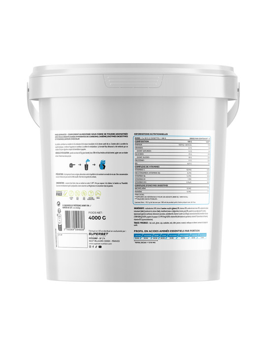 Ingrediënten Chocolade : maltodextrine 34%, volkoren havermeel (gluten) 20%, dextrose 20%, wasachtig maïszetmeel 10%, instant calciumcaseïnaat (melk) [calciumcaseïnaat (melk), emulgator (mono- en diglyceriden van vetzuren)] 8%, ontvette cacaopoeder 5%, aroma's, verdikkingsmiddel (xanthaangom), zoetstoffen (sucralose, acesulfaam K), vitamine C (L-ascorbinezuur), niacine (nicotinamide), ananasbromelaïne (1200 GDU/g) 0,02%, papaja papaïne (1,5 FIP U/mg) 0,02%, vitamine B6 (pyridoxine hydrochloride), vitamine B1 (thiaminemononitraat), vitamine B12 (cyanocobalamine).