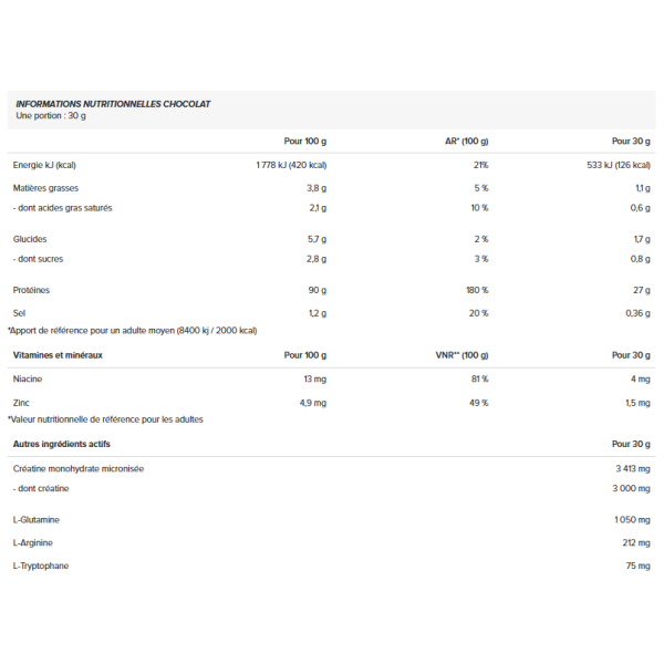 Chocolade-ingrediënten :Eiwitisolaat vanweiInstant 72% [melkeiwitisolaatwei, emulgator: lecithinen (soja)], gemicroniseerd creatinemonohydraat 11,4%, magere cacaopoeder, L-glutamine, aroma's, afroommiddel [gedeeltelijk gehard kokosvet,melkPoeder, emulgatoren (E471, E472a), glucosestroop, sacharose, eiwit vanmelk, stabilisator (kaliumfosfaten)], emulgator: lecithinen (soja), verdikkingsmiddelen (carrageen, xanthaangom), L-arginine, zout, antiklontermiddel (siliciumdioxide), L-tryptofaan, zoetstof (sucralose), zinkbisglycinaat, niacine (nicotinamide, nicotinezuur).