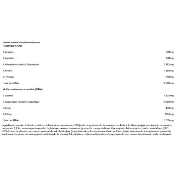 Chocolade-ingrediënten :Eiwitisolaat vanweiInstant 72% [melkeiwitisolaatwei, emulgator: lecithinen (soja)], gemicroniseerd creatinemonohydraat 11,4%, magere cacaopoeder, L-glutamine, aroma's, afroommiddel [gedeeltelijk gehard kokosvet,melkPoeder, emulgatoren (E471, E472a), glucosestroop, sacharose, eiwit uitmelk, stabilisator (kaliumfosfaten)], emulgator: lecithinen (soja), verdikkingsmiddelen (carrageen, xanthaangom), L-arginine, zout, antiklontermiddel (siliciumdioxide), L-tryptofaan, zoetstof (sucralose), zinkbisglycinaat, niacine (nicotinamide, nicotinezuur).