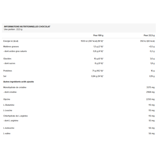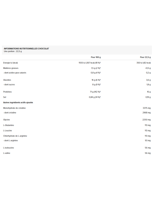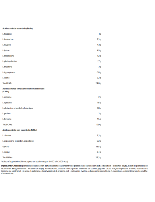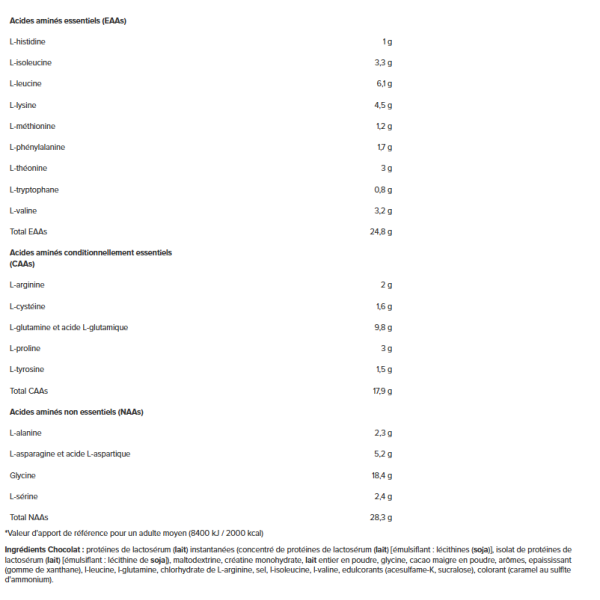 Ingrediënten - Chocolade : eiwitten wei (melk) (eiwitconcentraat van wei (melk) [emulgator: lecithinen (soja)], eiwitisolaat van wei (melk) [emulgator: lecithine van soja), maltodextrine, creatinemonohydraat, melk volkorenpoeder, glycine, magere cacaopoeder, aroma's, verdikkingsmiddel (xanthaangom), l-leucine, l-glutamine, l-arginine hydrochloride, zout, l-isoleucine, l-valine, zoetstoffen (acesulfaam-K, sucralose), kleurstof (ammoniumsulfietkaramel).