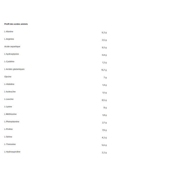 Ingrediënten - Kersensmaak: wei-eiwitisolaat (71%), collageenhydrolysaat [boeuf] (25%), natuurlijk aroma, kleurstof (anthocyanen), antischuimmiddel (antiklontermiddel (siliciumdioxide), emulgator (sorbitaanmonostearaat, zonnebloemlecithine)), zuurteregelaar (citroenzuur), zoetstof (sucralose), natriumhyaluronaat, vitamine C, mangaangluconaat, kopergluconaat.
