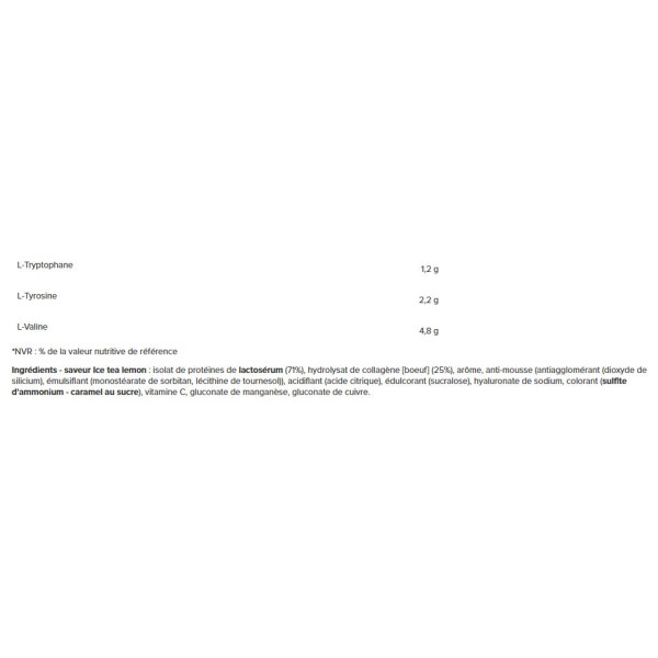 Ingrediënten - Ice tea citroen smaak: wei-eiwitisolaat (71%), collageenhydrolysaat [boeuf] (25%), aroma, antischuimmiddel (antiklontermiddel (siliciumdioxide), emulgator (sorbitaanmonostearaat, zonnebloemlecithine)), zuurteregelaar (citroenzuur), zoetstof (sucralose), natriumhyaluronaat, kleurstof(ammoniumsulfiet - suikerkaramel), vitamine C, mangaangluconaat, kopergluconaat.
