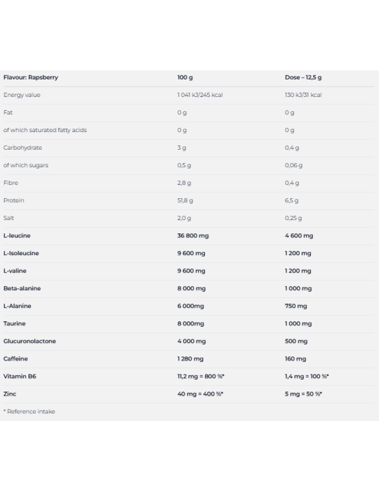 Ingrediënten Framboos: mengsel van instant BCAA's (L-leucine, L-isoleucine, L-valine, emulgator: sojalecithine), bèta-alanine, taurine, L-alanine, zuurteregelaar: citroenzuur, glucuronolacton, inuline, aroma, natriumcitraat, cafeïne, natriumchloride, antistollingsmiddel: calciumfosfaat, zwarte wortelconcentraat, zoetstoffen: sucralose en steviolglycosiden; zinkgluconaat, antiklontermiddel: siliciumdioxide, pyridoxinehydrochloride.