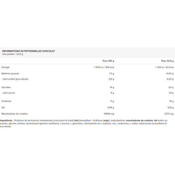 Ingrediënten - Chocolade: Instant wei-eiwit (concentraat & isolaat)(melk) [emulgator: lecithine(soja)], maltodextrine, creatinemonohydraat, volle melkpoeder, glycine, aroma's, verdikkingsmiddel (xanthaangom), L-leucine, L-glutamine, L-arginine hydrochloride, zout, L-isoleucine, L-valine, zoetstoffen (acesulfaam K, sucralose).