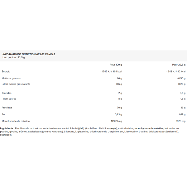 Ingrediënten - Vanille smaak: Instant wei-eiwit (concentraat & isolaat)(melk) [emulgator: lecithine(soja)], maltodextrine, creatinemonohydraat, volle melkpoeder, glycine, aroma's, verdikkingsmiddel (xanthaangom), L-leucine, L-glutamine, L-arginine hydrochloride, zout, L-isoleucine, L-valine, zoetstoffen (acesulfaam K, sucralose).