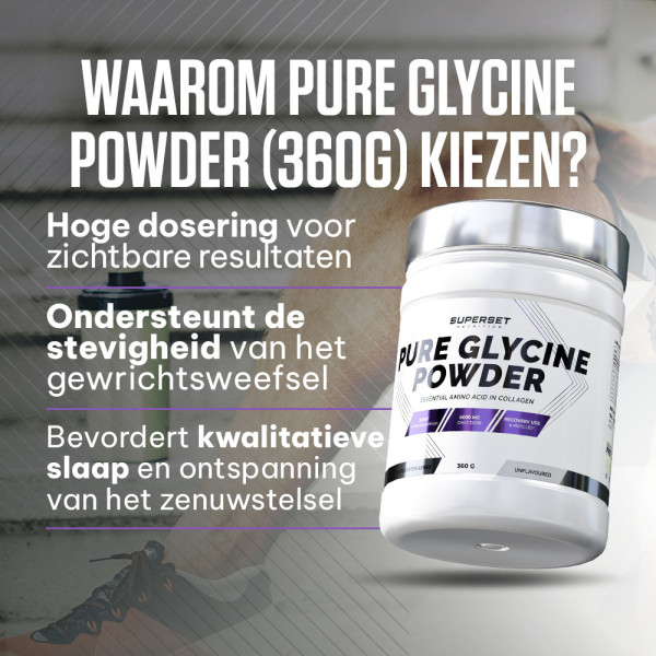 Ontwikkeld door het Franse merk Superset Nutrition, Pure Glycine Powder (360g) bevat een 100% glycine formule, zonder smaakstoffen, additieven of suiker. Natuurlijk, essentieel en effectief, glycine werkt op je spieren, je gewrichten en je algehele herstel: