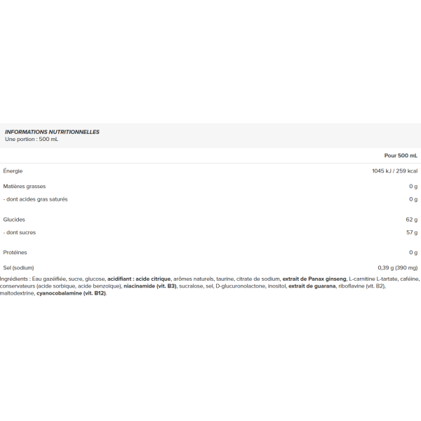 Ingrediënten: koolzuurhoudend water, suiker, glucose, zuurteregelaar: citroenzuur, natuurlijke aroma's, taurine, natriumcitraat, Panax ginseng extract, L-carnitine L-tartaat, cafeïne, conserveermiddelen (sorbinezuur, benzoëzuur), niacinamide (vit. B3), sucralose, zout, D-glucuronolacton, inositol, guarana extract, riboflavine (vit. B2), maltodextrine, cyanocobalamine (vit. B12).