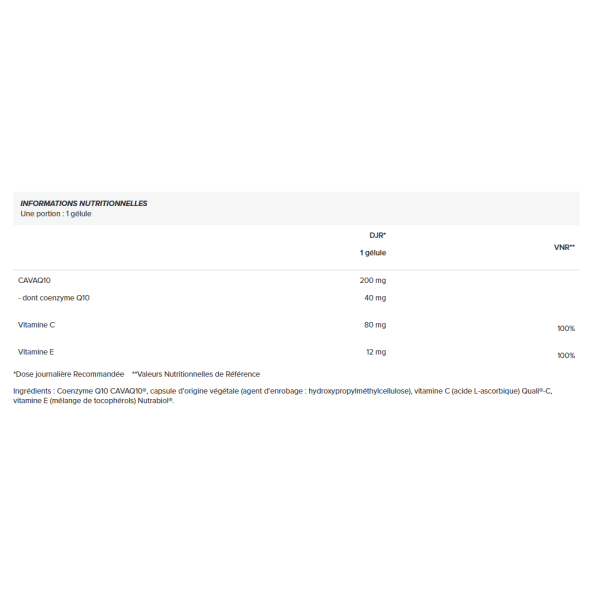 Ingrediënten: Co-enzym Q10 CAVAQ10®, plantaardige capsule (omhulsel: hydroxypropylmethylcellulose), vitamine C (L-ascorbinezuur) Quali®-C, vitamine E (gemengde tocoferolen) Nutrabiol®.