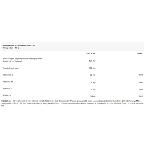 Ingrediënten: acaciavezels, natuurlijk aroma, granaatappelschilextract (Punica granatum L), L-ascorbinezuur (vitamine C), sinaasappelextracten uit Moto, Sanguinello en Tarocco (citrus sinensis var Moro, Sanguinello en Tarocco), met selenium verrijkte gist, dl-alfa-tocoferolacetaat (vitamine E), nicotinamide (vitamine B3)