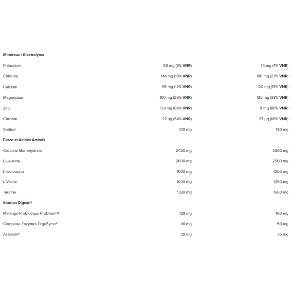 Ingrediënten - Tropische smaak : koolhydraatmatrix (maltodextrine, sterk vertakte cyclische dextrine), rundereiwitisolaat, zuurteregelaar (citroenzuur), aroma, creatinemonohydraat, L-leucine, taurine, L-isoleucine, L-valine, calciumbisglycinaat, magnesiumbisglycinaat, kaliumcitraten, kleurstof (curcumine-extract), antiklontermiddel (siliciumdioxide), zoetstof (sucralose), Probiwin™ probioticamix (Saccharomyces boulardii, Lactobacillus acidophilus, Bifidobacterium longum, Bifidobacterium infantis, Lactobacillus casei, Lactobacillus rhamnosus, Streptococcus thermophilus, Lactobacillus plantarum, Bifidobacterium breve, Bifidobacterium bifidum), vitamine C (L-ascorbinezuur), zinkgluconaat. DigeZyme® enzymcomplex (amylase, protease, cellulase, lactase, lipase), AstraGin® (Astragalus Membranaceusextract) [racine] en Panax Notoginseng-extract [racine]), niacine, pantotheenzuur, vitamine B6, thiamine, chroompicolinaat en vitamine B12.