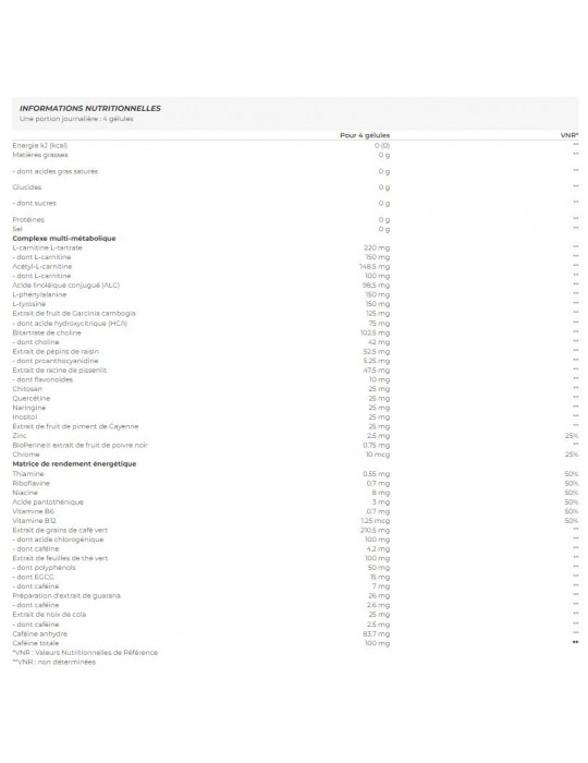 [gélatine, agent d'enrobage (gomme laque), colorant (oxydes et hydroxydes de fer), régulateurs d'acidité (hydroxyde d'ammonium, hydroxyde de potassium)] [glycérides (riches en CLA), extrait sec de sirop de maïs, caséinate de sodium (lait), anti-agglomérant (dioxyde de silicium), stabilisant (phosphates de potassium)]NRV: Voedingsstoffen Referentiewaarde **NRV: niet bepaaldIngrediënten: capsulehuls , L-carnitine L-tartraat 9,8%, groene koffieboon extract (Coffea robusta) 9,4%, CLA poeder . 7,3%, L-fenylalanine 6,7%, L-tyrosine 6,7%, acetyl-L-carnitine 6,6%, Garcinia cambogia fruitextract 5,6%, cholinebitartraat, vulstof (cellulosegel), groene thee bladextract (Camellia sinensis) 4,5%, watervrij cafeïne 3,7%, druivenpitextract (Vitis vinifera) 3,3%, paardenbloemwortelextract (Taraxacum officinale) 2,2%, chitosan (schaaldieren), quercetine (uit het bloemknopextract van Sophora japonica) 1,2%, [extrait de graines de guarana (Paullinia cupana), caféine] [extrait de graines de noix de cola (Cola nitida), maltodextrine] guarana extractpreparaat 1,2%, naringine 1,1%, kola noot extractpreparaat 1,1%, inositol, cayennepeper vruchtenextract (Capsicum frutescens) 1,1%, antiklontermiddelen (magnesiumzouten van vetzuren, siliciumdioxide), zinkbisglycinaat, nicotinamide, D-pantothenaat, calcium, pyridoxine hydrochloride, BioPerine® extract van zwarte peper (Piper nigrum) 0,03%, riboflavine, thiaminemononitraat, cyanocobalamine, chroompicolinaat.
