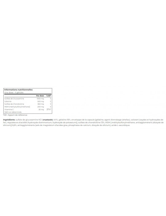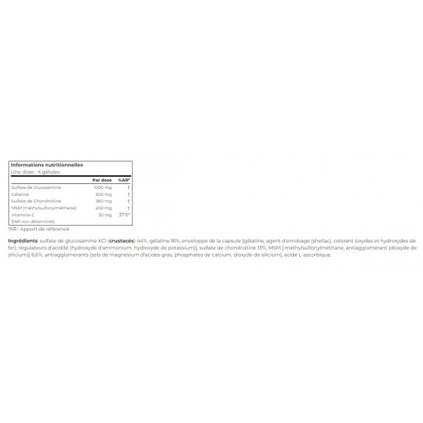 [gélatine, agent d'enrobage (shellac), colorant (oxydes et hydroxydes de fer), régulateurs d'acidité (hydroxyde d'ammonium, hydroxyde de potassium)] [ méthylsulfonylméthane, antiagglomérant (dioxyde de silicium)] Ingrediënten: glucosaminesulfaat KCl(schaaldieren) 44%, gelatine 16%, capsulehuls, chondroïtinesulfaat 13%, MSM 6,6%, antiklontermiddelen (magnesiumzouten van vetzuren, calciumfosfaten, siliciumdioxide), L-ascorbinezuur.