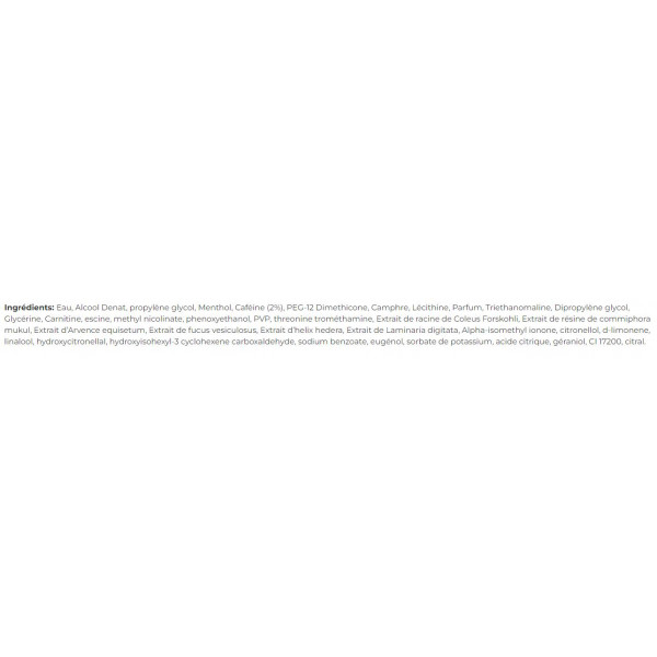 Ingrediënten: Water, Denat alcohol, propyleenglycol, Menthol, Cafeïne (2%), PEG-12 Dimethicone, Kamfer, Lecithine, Parfum, Triethanomaline, Dipropyleenglycol, Glycerine, Carnitine, escine, methyl nicolinaat, fenoxyethanol, PVP, threonine tromethamine, Coleus Forskohli wortel extract, Commiphora mukul hars extract, Arvence equisetum extract, Fucus vesiculosus extract, Helix hedera extract, Laminaria digitata extract, Alfa-isomethyl ionon, citronellol, d-limoneen, linalool, hydroxycitronellal, hydroxyisohexyl-3 cyclohexeen carboxaldehyde, natriumbenzoaat, eugenol, kaliumsorbaat, citroenzuur, geraniol, CI 17200, citral.