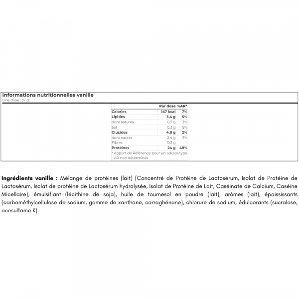 Ingredientes da baunilha:Mistura de proteínas (leite) (ConcentradoSoro de leite, isolado de proteínaSoro de leite, isolado proteicoSoro de leiteIsolado de proteína, hidrolisadoLeite, CaseinatoDe cálcio,CaseínaMicellar), emulsionante (lecitina deSoja), óleo de girassol em pó (leite), aromas (leite), espessantes (carbometilcelulose de sódio, goma xantana, carragenina), cloreto de sódio, edulcorantes (sucralose, acessulfame K).