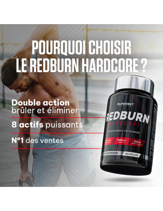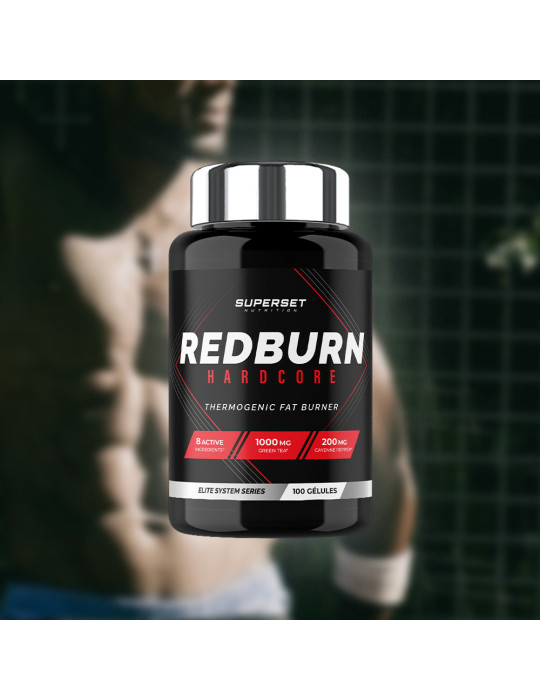 REDBURN HARDCORE (100 CAPS) é o seu aliado incontornável na busca da definição muscular. Graças à sua fórmula, estimula a termogénese e favorece a mobilização das gorduras, o que lhe permite visar uma redução significativa da sua gordura corporal. Recomendado por treinadores e especialistas, este queimador de gorduras integra-se perfeitamente na sua alimentação para otimizar a sua perda de peso.