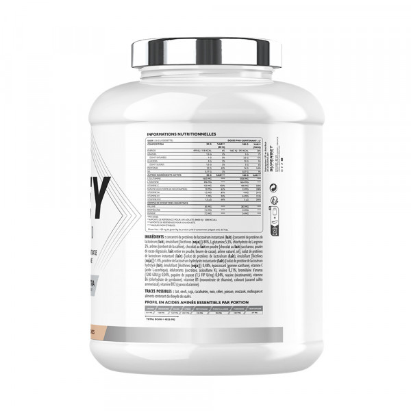 Ingredientes ChoconutConcentrado instantâneo de proteínas de soro de leite (leite) {concentrado de proteínas de soro de leite (leite), emulsionante [lecitinas (soja)]} 77%, cacau em pó desengordurado 9%, L-glutamina 5,5%, aromas (contém cafeína), cloridrato de L-arginina 2%, isolado instantâneo de proteína de soro de leite (leite) {Isolado de proteína de soro de leite (leite), emulsionante [lecitinas (soja)]} 1,4%, proteína de soro de leite hidrolisada instantânea (leite) {Isolado de proteína de soro de leite hidrolisado (leite), emulsionante [lecitinas (soja)]} 0,48%, espessante (goma xantana), vitamina C (ácido L-ascórbico), edulcorantes (sucralose, acessulfame K), inulina 0,31%, chocolate de leite em pó [chocolat au lait (saccharose, cacao dégraissé en poudre, lait entier en poudre, beurre de cacao), arôme naturel, sel] 0,2%, bromelaína de ananás (1200 GDU/g) 0,04%, papaína de papaia (1,5 FIP U/mg) 0,04%, niacina (nicotinamida), vitamina B6 (cloridrato de piridoxina), vitamina B1 (mononitrato de tiamina), vitamina B12 (cianocobalamina).
