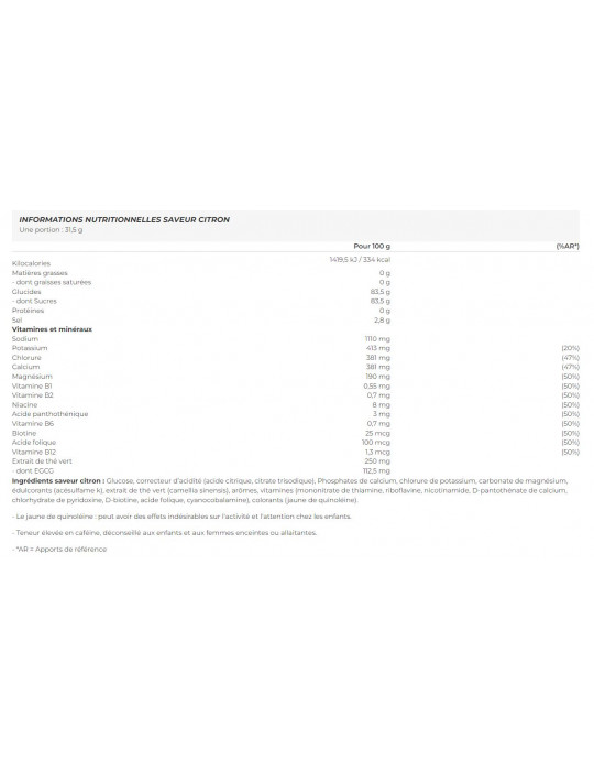 Ingredientes do sabor a limão : Glucose, regulador de acidez (ácido cítrico, citrato trissódico), fosfatos de cálcio, cloreto de potássio, carbonato de magnésio, edulcorantes (acessulfame k), extrato de chá verde (camellia sinensis), aromatizantes, vitaminas (mononitrato de tiamina, riboflavina, nicotinamida, pantotenato de D-cálcio, cloridrato de piridoxina, D-biotina, ácido fólico, cianocobalamina), corantes (amarelo de quinoleína).