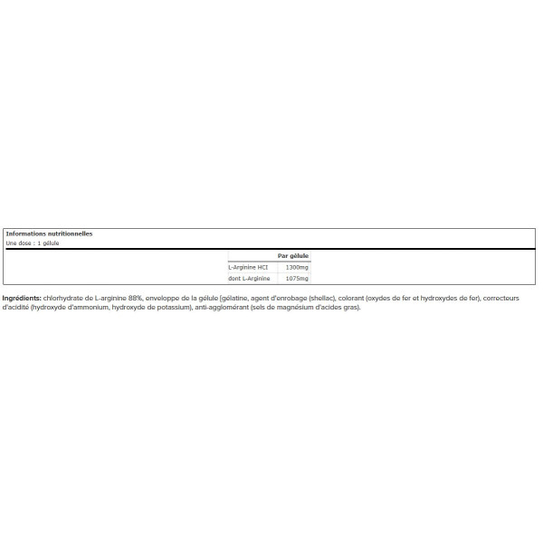 Ingredientes: Cloridrato de L-arginina 88%, invólucro da cápsula [gelatina, agente de revestimento (goma-laca), corantes (óxidos e hidróxidos de ferro), reguladores de acidez (hidróxido de amónio, hidróxido de potássio), antiaglomerante (sais de magnésio de ácidos gordos).