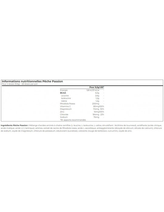 Ingredientes Pêche Passion : Mistura de aminoácidos de cadeia ramificada (L-leucina, L-isoleucina, L-valina, emulsionante : lecitina de girassol), acidificantes (ácido cítrico, ácido málico, ácido L(+)-tartárico), aromas, extrato de raiz de Rhodiola rosea, ácido L-ascórbico, antiaglomerantes (dióxido de silício, silicato de cálcio), cloreto de sódio, óxido de magnésio, cloreto de potássio, edulcorante (sucralose), corantes (vermelho de beterraba, curcumina), óxido de zinco.