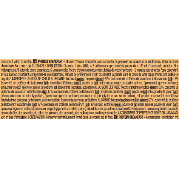Ingredientes Morango: aveia em flocos 60%(glúten), concentrado de soro de leite (de leite, emulsionante: lecitina de soja), leite gordo em pó, aromas (morango, baunilha), pedaços de morango liofilizados, iogurte em pó (à base de leite), espessante (goma xantana), intensificador de sabor (glicina), cloreto de sódio, corante (vermelho de beterraba), edulcorantes (sucralose, acessulfame k).