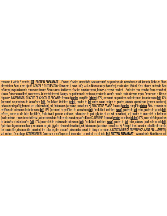 Mesmo quando os seus armários estão praticamente vazios, o Protein Breakfast proporciona um pequeno-almoço rico e completo antes de começar o dia. O curto tempo de digestão das proteínas (cerca de 1,5 horas) significa que pode começar bem o dia sem o estômago pesado ou a dormência que advém de refeições demasiado ricas. O seu organismo fica perfeitamente nutrido graças à combinação de proteínas rápidas e de flocos de aveia, que fornecem uma energia duradoura e de libertação lenta graças ao seu baixo índice glicémico.