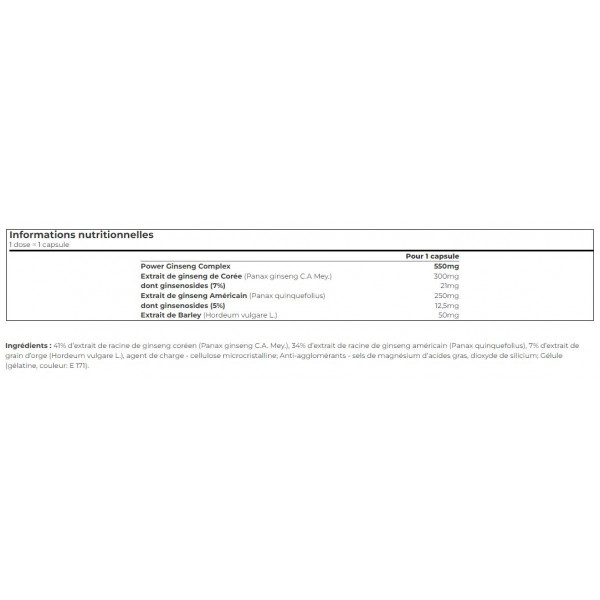 C.A. Ingredientes: 41% de extrato de raiz de ginseng coreano (Panax ginseng Mey.), 34% de extrato de raiz de ginseng americano (Panax quinquefolius), 7% de extrato de grão de cevada (Hordeum vulgare L.), agente de volume - celulose microcristalina; agentes antiaglomerantes - sais de magnésio de ácidos gordos, dióxido de silício; cápsula (gelatina, corante: E 171) .
