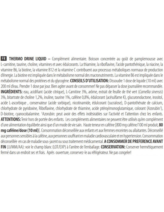 Os suplementos alimentares devem ser utilizados como parte de um estilo de vida saudável e não como substitutos de um regime alimentar variado e equilibrado. Não exceder a dose diária recomendada. Manter fora do alcance das crianças. [800 mg caféine/100 ml produit, 80 mg caféine/dose (10 ml)] Elevado teor de cafeína. Não recomendado a mulheres grávidas ou a amamentar, nem a adolescentes. Não recomendado a pessoas sensíveis à cafeína ou que sofram de doenças cardiovasculares ou de hipertensão arterial. Não é recomendado o consumo em caso de doença subjacente ou durante a toma de medicamentos. Conservar em local fresco e seco, bem fechado, na sua embalagem original, ao abrigo do calor e da luz.