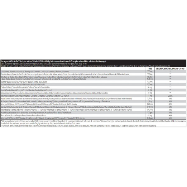 Ingredientes : Água, L-carnitina, bitartarato de colina, ácido comestível (ácido cítrico), taurina, inulina, cafeína, inositol, glucuronolactona, extrato de folhas de chá verde (Camellia Sinensis), conservante (sorbato de potássio), ácido L-ascórbico, nicotinamida, aromatizantes, edulcorantes (sucralose, acessulfame K), acetato de DL-alfa-tocoferol, pantotenato de cálcio, corante (azorubina)*, cloridrato de piridoxina, riboflavina, cloridrato de tiamina, ácido fólico, biotina, cianocobalamina.