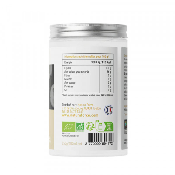 Natura ForceO óleo de coco é extraído por prensagem a frio, o que significa que conserva todos os seus aromas e o seu cheiro delicioso. Não refinado, é também certificado como 100% biológico!