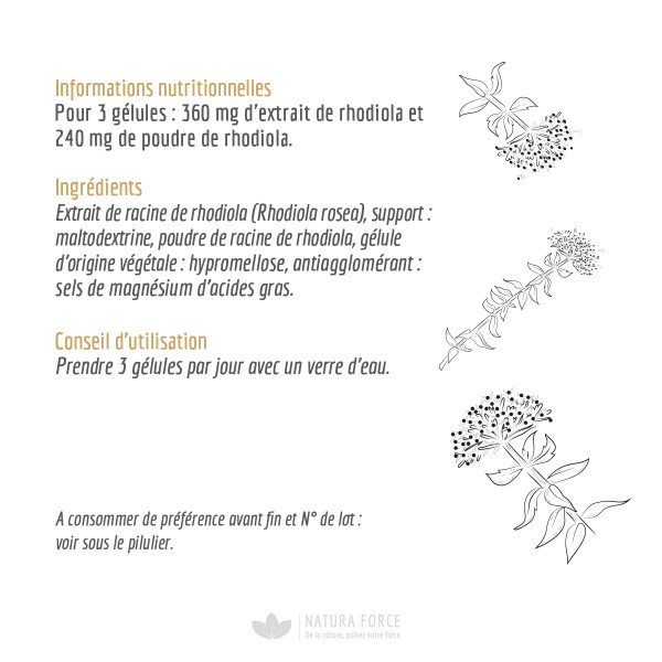 Natura ForceRhodiola Rosea contém um extrato de Rhodiola (360 mg por dose) e é suficientemente rico em rosavinas e salidrósidos para ser totalmente eficaz.