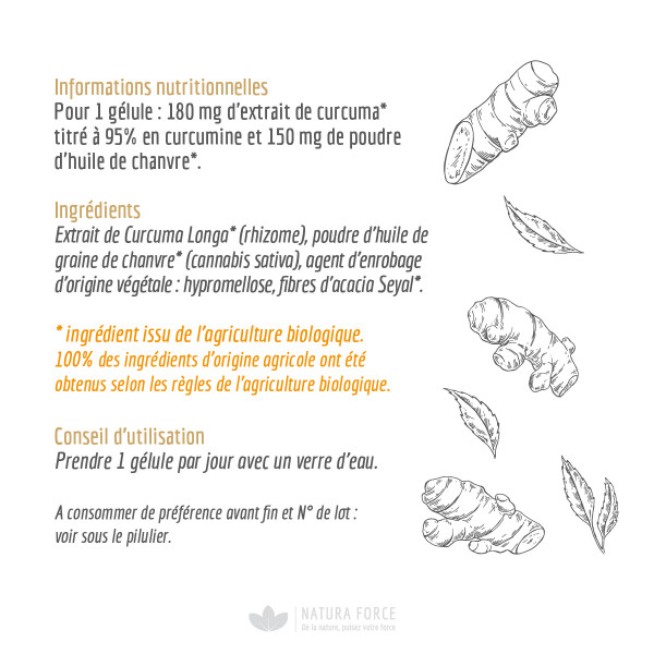 Disponível em cápsulas vegetais fabricadas a partir de óleo de cânhamo em pó, particularmente rico em ómega 3, a biodisponibilidade da curcumina é maior, o que aumenta os benefícios para a saúde. A molécula é mais bem assimilada pelo organismo.