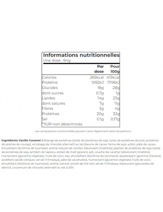 Ingredientes Caramelo de baunilha : Mistura de proteínas [isolado proteico de soja, isolado proteico de ervilha, proteína de sementes de abóbora], cobertura de chocolate de leite [manteiga de cacau, farinha de soja, xilitol, massa de cacau, emulsionante (lecitina de girassol, aroma natural de baunilha), edulcorante (maltitol)], [édulcorant (maltitol), Humectant (glycérine végétale), huile de noix de coco, eau, émulsifiant (lécithine de tournesol), épaississant (gomme d'acacia), acidifiant (acide citrique), sel]Himalaya chips de proteína de soja (isolado de proteína de soja, amido de tapioca, extrato de malte(glúten), sal), cobertura de caramelo, pasta de amendoim, humectante (glicerina vegetal), óleo de coco, emulsionante (lecitina de girassol), aroma natural, extrato de chá verde, sal de , edulcorante (glicosídeos de esteviol).