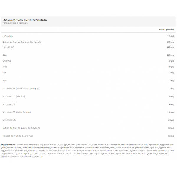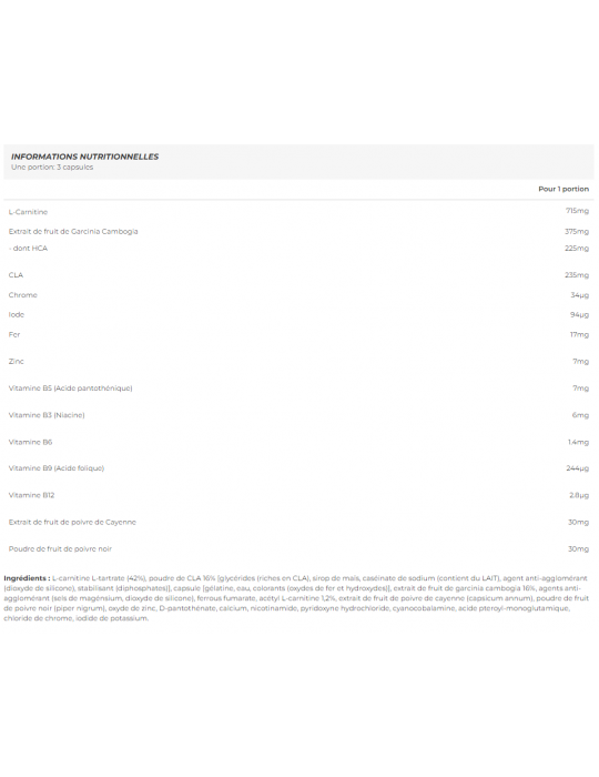 Ingredientes: [gélatine, eau, colorants (oxydes de fer et hydroxydes)] L-carnitina L-tartarato (42%), CLA em pó 16% [glicéridos (ricos em CLA), xarope de milho, caseinato de sódio (contém leite), agente antiaglomerante (dióxido de silicone), estabilizador (difosfatos)], cápsula, extrato de fruto de garcinia cambogia 16%, agentes antiaglomerantes (sais de magnésio, dióxido de silicone), fumarato ferroso, acetil L-carnitina 1,2%, extrato de frutos de pimenta de caiena (capsicum annum), pó de frutos de pimenta preta (piper nigrum), óxido de zinco, D-pantotenato, cálcio, nicotinamida, cloridrato de piridoxina, cianocobalamina, ácido pteroil-monoglutâmico, cloreto de crómio, iodeto de potássio.